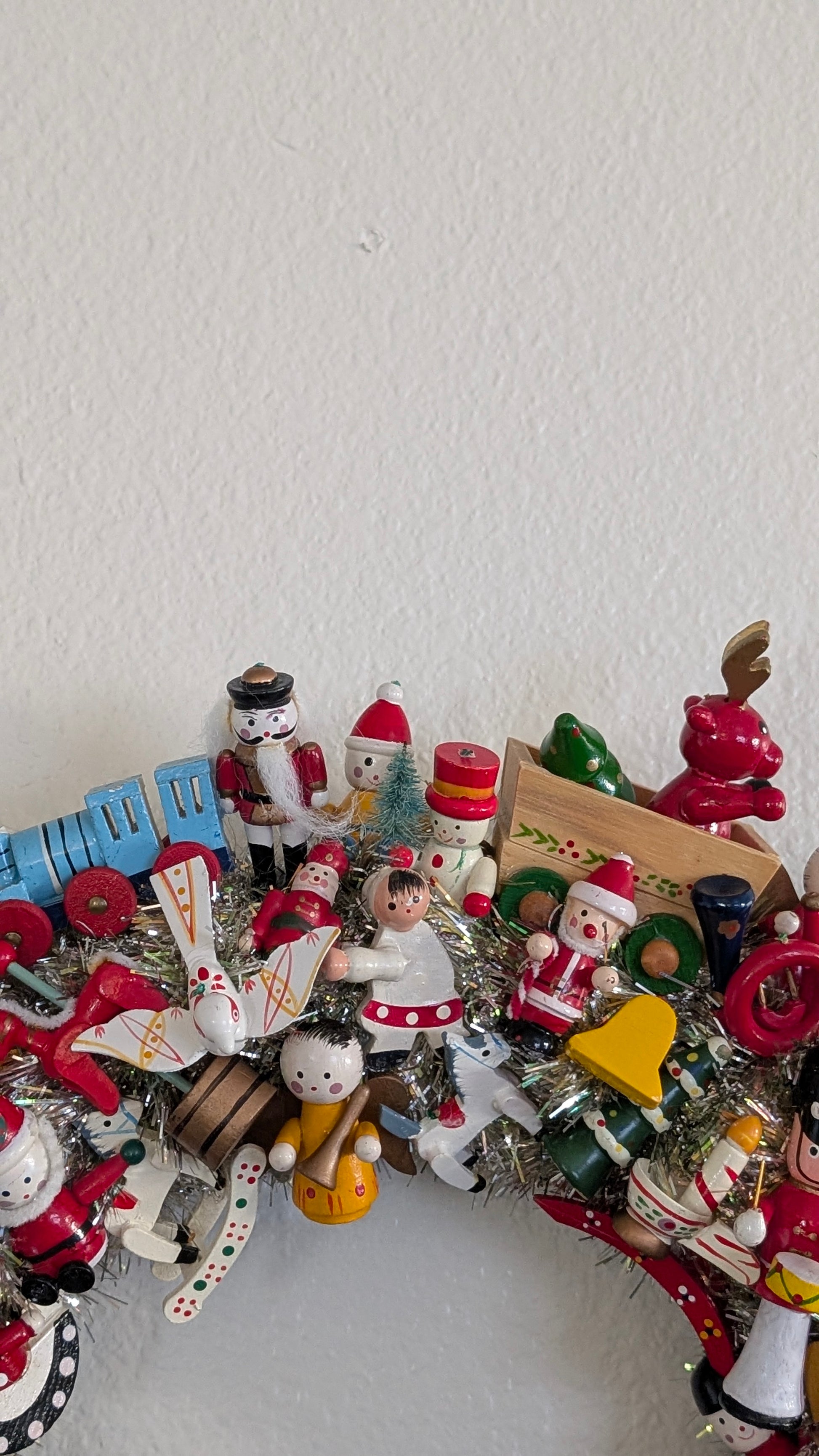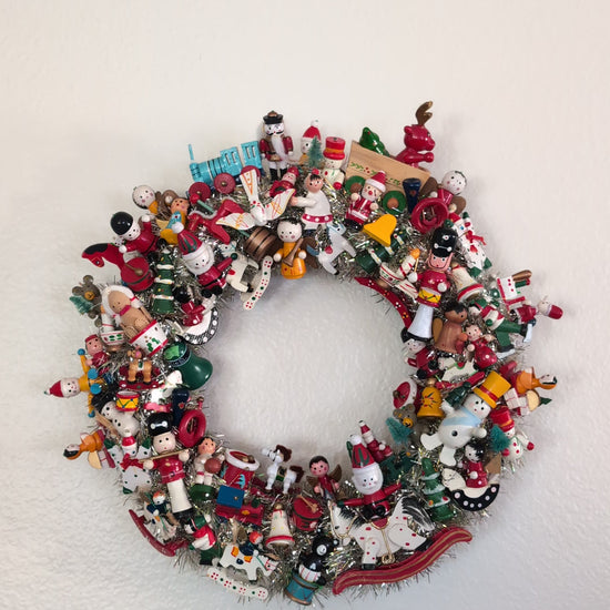 This wreath features 73 vintage wooden Christmas ornaments on top of vintage tinsel. The wreath measures roughly 15" at the widest point. There is no hanging hardware included. However, a standard wreath holder or a long nail will hold this wreath up.